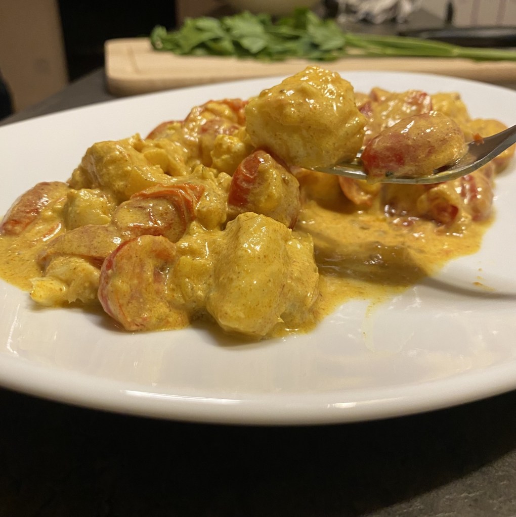 3. Ajout du curry : Ajoutez une cuillère de pâte de curry, mélangez bien avec les tomates.